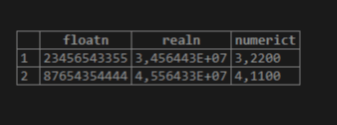 (floatn float8 not null, realn real not null, numerict numeric(3, 2));