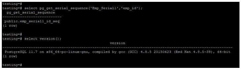 - The figure below shows the emp_serial1_id_seq function by using the pg_get_serial_sequence function.
