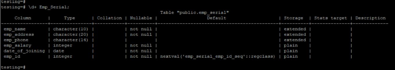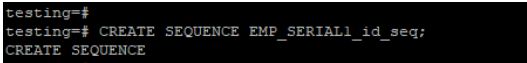 - We have created a serial data type using a sequence. We have created the sequence name as emp_serial1_id_seq.