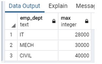 - In the above example, suppose we need to calculate the max salary of an employee in each department by using group by and Order by clause at that time, we use the above statement. In this example max salary of the IT dept is 28000, the max salary of the MECH dept is 30000, and the max salary of the CIVIL dept is 40000. Illustrate the end result of the above declaration by using the use of the following snapshot.