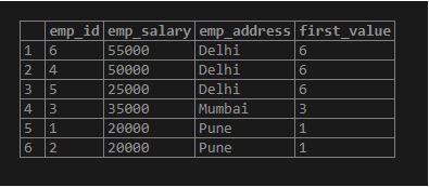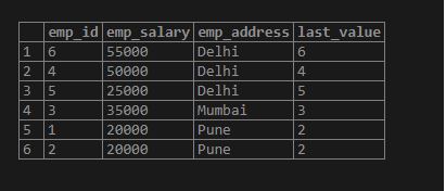SELECT emp_id, emp_salary, emp_address, last_value(emp_id) OVER (PARTITION BY emp_address ORDER BY emp_salary DESC) FROM employee;