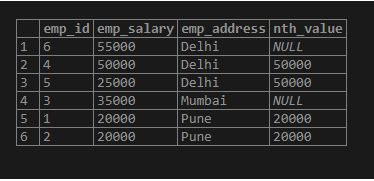SELECT emp_id, emp_salary, emp_address, nth_value(emp_salary, 2) OVER (PARTITION BY emp_address ORDER BY emp_salary DESC) FROM employee;
