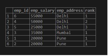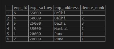SELECT emp_id, emp_salary, emp_address, Dense_rank () OVER (PARTITION BY emp_address ORDER BY emp_salary DESC) FROM employee;