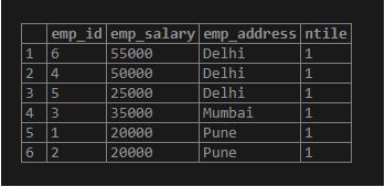 SELECT emp_id, emp_salary, emp_address, ntile(1) OVER (PARTITION BY emp_address ORDER BY emp_salary DESC) FROM employee;