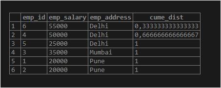 SELECT emp_id, emp_salary, emp_address, cume_dist() OVER (PARTITION BY emp_address ORDER BY emp_salary DESC) FROM employee;