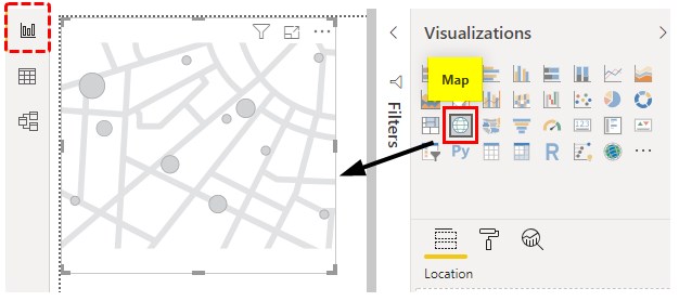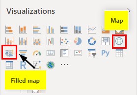 In Power BI, there are 2 types of Maps available. One is a Map and the other is Filled Map. Both types are there in the Visualization section as shown below.