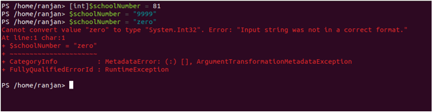 [Int]$number="Ranjan"//throw an error as we defined it as Int and assigning the value of the string