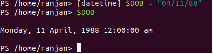 [datetime] $DOB = "04/11/88" //It will convert string of date to Date objects.