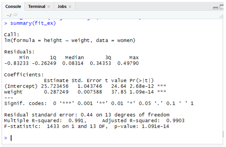The output here shows coefficients and residuals values. The intercept value in our example is not with a negative value. It shows overall a positive value means that the predictions get increased as there is an increase in a true value. This is our expected women’s height. In the below graph we could see that for an additional inch of height the weight increases by 0.2.