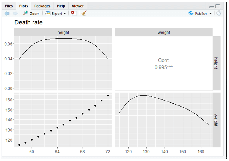 > ggpairs(data=women, columns=1:2, title="Death rate")