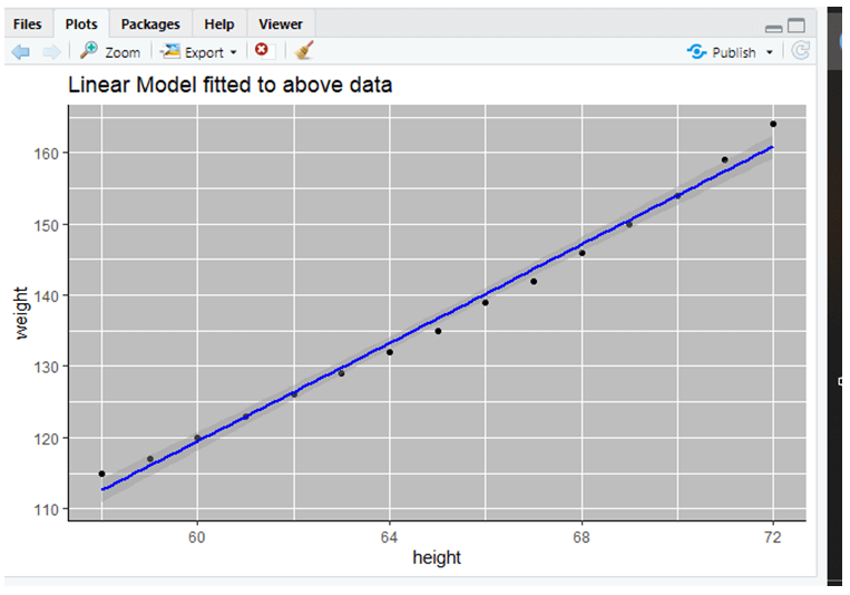Here we shall have a look at the model which fits the data for weight and height. This can be done by using ggplot function to do a scatter plot of the given data. So here is the plot yielded in RStudio using the function: