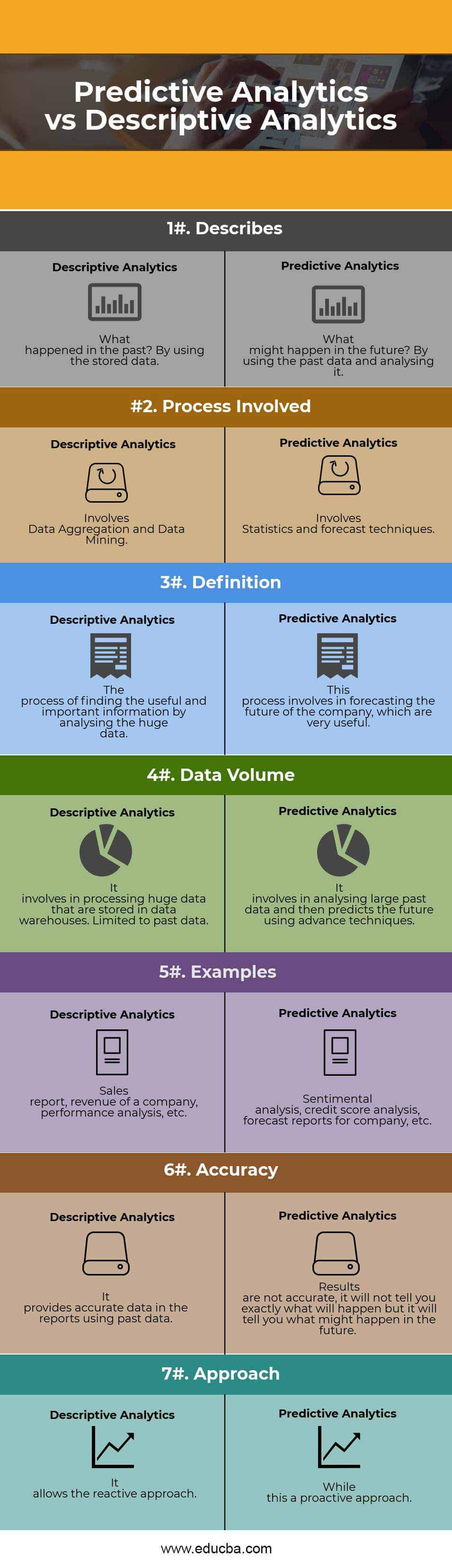 Below is the top 7 comparison between Predictive Analytics and Descriptive Analytics: