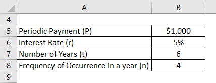 Let us take the example of David who is expected to receive a series of equal quarterly future cash inflow of $1,000 for the next six years. Calculate the present value of the future cash inflow if the relevant discounting rate based on the ongoing market rate is 5% while the payment is received: