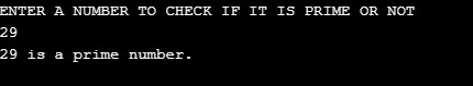 Code Explanation: In the output, we see whether an inputted number is prime or not. First, we enter 29 as a number to check whether it is prime or not. We find out that 29 is a prime number as it is divisible by only the number of unity and the number itself. Except for that, it is not divisible by any other number.