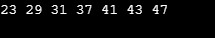 Code Explanation: In the above code, we find the number of prime numbers between 20 and 50. We find the numbers which are divisible only by unity and the number itself. The numbers which are prime are 23, 29, 31, 37, 41, 43, and 47. The code uses a single for loop, which is used to check the number’s divisibility by the respective for loop control variable. If the number is divisible, it is a composite number, and if the number is not divisible, it is a prime number.