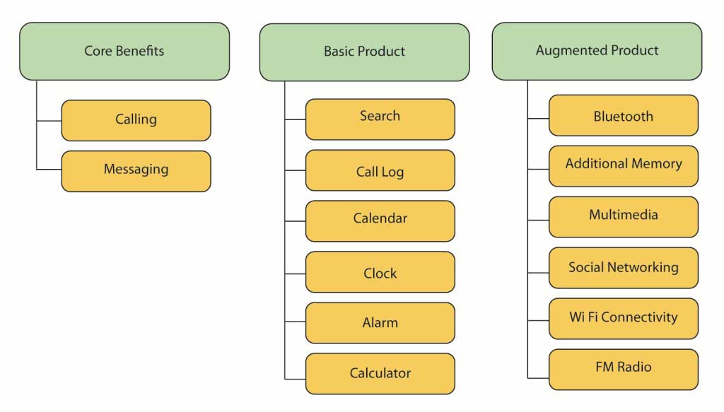 - Primary Product: By essential product, minimum product offerings are meant. For a mobile phone, calling, sending messages, searching, calling logs, calendars, clocks, alarms, and calculators are basic product functionalities. Primary products are different from each other by how well they cater to different customer needs.