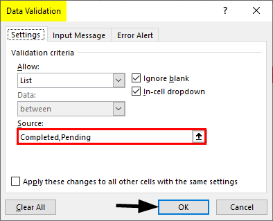 Simultaneously you can create & apply a data validation list to the status range; by selecting the complete status range, press ALT+D+L so that the “Data Validation” popup appears under the “Validation criteria” in the “Allow” dropdown, select “List” and in the source enter the two status parameters, i.e., “Completed & Pending” separated by a comma.