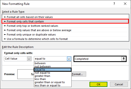 Under the New Formatting Rule, select “Format only cells that contain” under the cell values, select equal to enter the keyword “Completed”, and click on the format option for color selection.