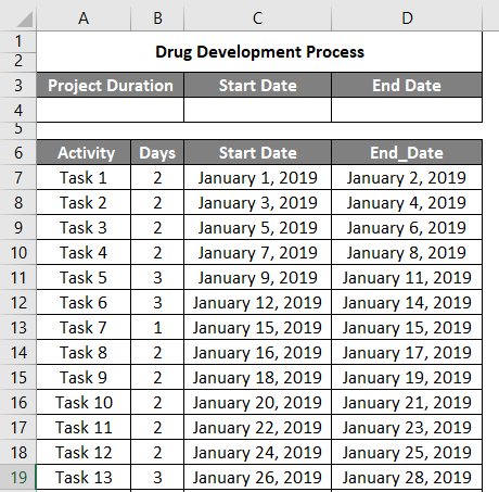 Enter the task details of the project & estimated duration, its start date & end date. The date should be entered in the below-mentioned format for better appearance, and it is applied to both the start date & end date column range.