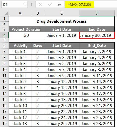 Apply the MAX formula in cell “D4” to get the maximum value under the project End Date range and enter the total project duration.