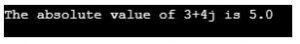 Code Explanation: For finding the absolute value of a complex number, we need to square the real and imaginary parts of the complex number, add them, and then take a square root of the result. Hence, we get the value 5.0.