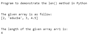 This is a guide to Python Array Length. Here we discuss working of the len() in python to calculate the total number of items present in the given array along with examples and its code implementation. You may also have a look at the following articles to learn more –