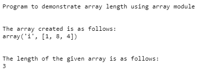 In Python, it provides a module named array where it holds different methods and it is easy for declaring array also. In the below section, let us see how to use an array module for declaring array and finding its length using len() function. Below is the program to demonstrate how to find array length using the array module.