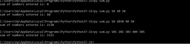 Explanation: sys.argv is imported. Then for loop is being used to traverse the argv list to calculate the sum of command-line arguments. Since arguments are of string type they are the first typecast to integer type before sum operation. The result is then printed as shown in the screenshot above.