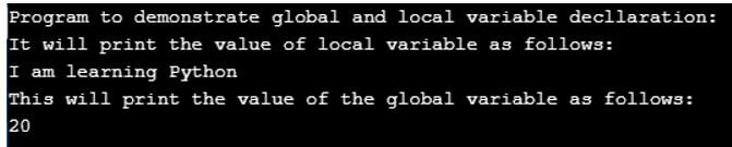 There are two types of variables that can be declared in Python such as global and local variables. Now let us see below in detail about these variables with examples. The variables used or can be accessed in the entire program or other functions or modules within the program are called global variables. Whereas the variables that are declared and used within the program’s function or module, such variables are known as local variables. We will see both these variables in one single program below.