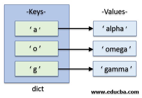 Suppose we are creating a dictionary of a, o ,g having the values as alpha, beta & gamma, named dict then, in that case, the keys can be retrieved using the below statement: