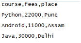 p_details =[('course','fees','place'),('Python',22000,'Pune'),('Android',11000,'Assam'),('Java',30000,'Delhi')]