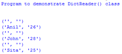 This class uses a dictionary object which is created for mapping the data to read it to the dictionary whose key is given by field names, but if the keys are not defined or declared, then by default, it will take first row data as keys of the dictionary. Let us demonstrate in the below example.