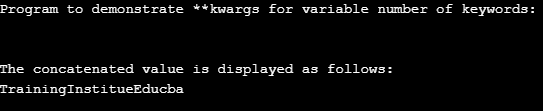 In the above program, we can see that we have defined a function using the argument variable as kwargs with two stars before it. So when we call this function to concatenate(), which will iterate through the given kwargs dictionary a= “Educba”, b= “Training”, c= “Institue” using “for” loop. Then it prints all these words together, as shown in the output and screenshot above.