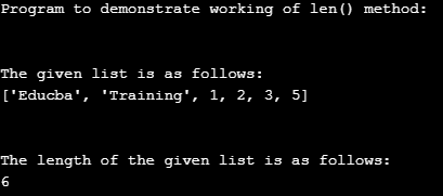 In the above program, we can see we have declared a list with the name “lst”, and we are printing the size of this list using the len() method, which is used as len(last), which returns the output as “6” as there are 6 elements in the list “lst”.