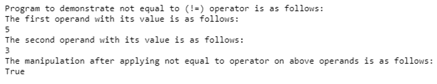 In the above program, we can see we have declared two variables, x and y, which are considered as operands with values 5 and 3. We can see we are trying to print the result of the expression x != y, which will print “True” as both the given operands are not equal.