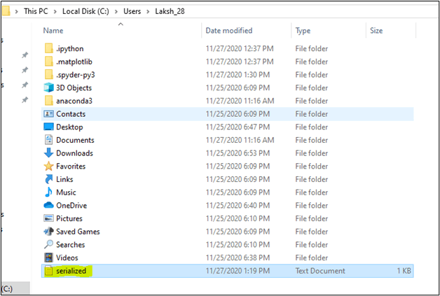 We have defined a “file” object as well. This object will allow us to store the serialized bytes into a text file at a working directory with the name “serialized”.See the output below: