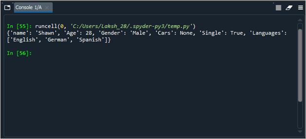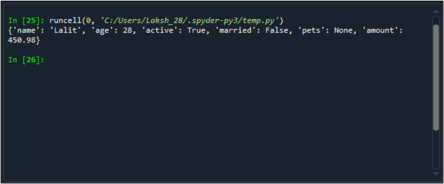 Here, we have used the same file object we have created a serialization in the previous example. Then we have used the pickle.load() to read that file and convert it into the original python object that is a dictionary. See the output as shown below: