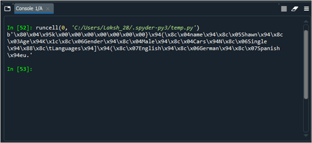 Now, we will use the pickle.dumps() method. Which allows us to serialize a python object into a byte-sized text object. However, the difference here is, this method doesn’t allow us to store the result into a file; rather, it allows the result to print out directly in the console. See an example below:
