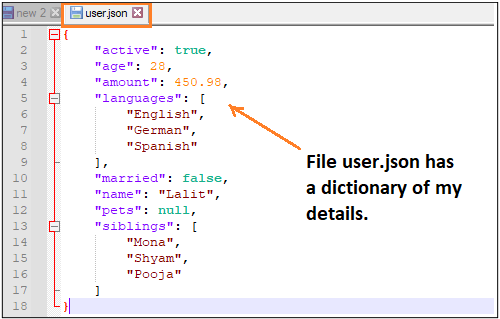If we try to open this file in any text editor, we will have the same dictionary of JSON string as in the above example. Please find below is the screenshot for your reference: