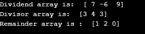 Explanation: To calculate the remainder of each item in a list or array, use the numpy.remainder() function as demonstrated in the example above. We have two arrays [7 -6 9] and [3 4 3], so 7 % 3,3 goes into 7 two times, so the remainder is 1, -6 % 4, 4 goes into 6 one time, so the remainder is 2, 9 % 3, 3 goes into 9 three times, so the remainder is 0. The array of remainder values will be [1 2 0].
