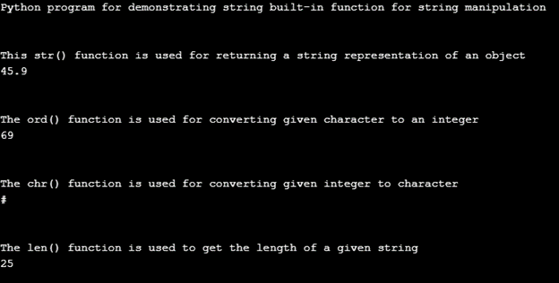 In the above program, we can see that we have used 4 different string built-in functions to demonstrate the string manipulation using these string functions. In the above program, we can see the str() function will return the object that is passed to this function in string representation, ord() function, which will return the integer form of the given character, chr() function for returning the character form for the given integer passed to the function, len() function returns the number of characters in the given string as the argument.
