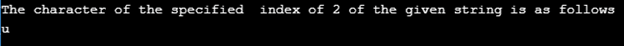 In the above program, we can see we declared a string “Educba”, and each has an index as E as 0, d as 1, u as 2, c as 3, b as 4, a as 5. There we have asked to print the character with index 2, which is “u”.
