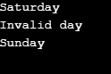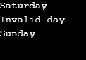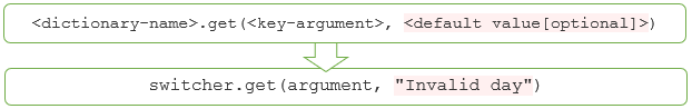 In this example, let us pass 6 as an input argument or input key, which will be searched in the keys of the dictionary (switcher). As the key=6 is found, then it will return the value as Saturday. Now pass 8 as input key, which will be searched in the keys of the dictionary (switcher). As the key=8 is not found, then it will return the default value as an Invalid day.