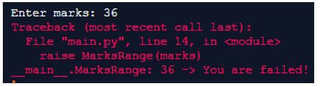 In this above program, we have created a custom class MarksRange and inherited the Base Class Exception.