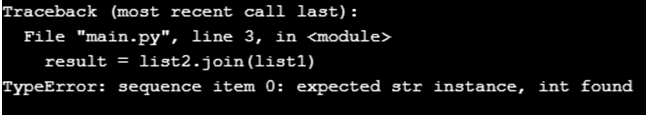 As you can see in the above program, we have created a list of list1 and list2 as a string variable. Now we are trying to join the list1 with list2, but python returns the type error. Because list2 is of string type, and python is expecting each element of the list1 to be a string, but it’s an integer.