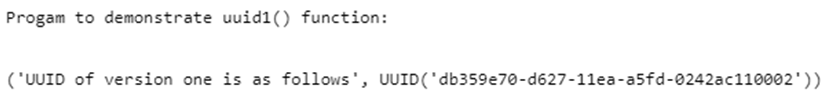 In the below section let us see a few examples of the use of function uuid1(), uuid3(), uuid4() and uuid5() using Python UUID module which is mainly used for generating UUID using MAC address. We will also see how the UUID looks like which means the structure of UUID.