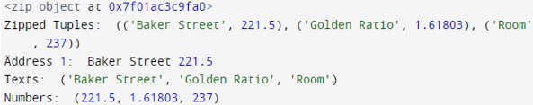 Explanation: Two iterables are defined. They can be anything. For example, Tuples or Lists. Here, Tuples are used in the first one – texts and in the second one – numbers. Baker Street, Golden Ratio, Room are given with respective numbers. The numbers automatically align and match each other by zipping the two tuples together. For Zipping the two, we use the zip function. When you print the zipped function, it returns an iterable To convert it to a normal format, we use Tuple, which prints the result in the Tuple form. Each address and its particulate is returned if asked for it by using the indices, for instance. We have created and printed three aggregated tuples. Let’s assume that we have a list of tuples we want to unzip to get separate iterables. Searching for a function named unzipped which doesn’t exist perhaps, but there is an unzip operator, which is an asterisk. So, after you pass the aggregated tuples and each tuple has elements and that is printed in the results.