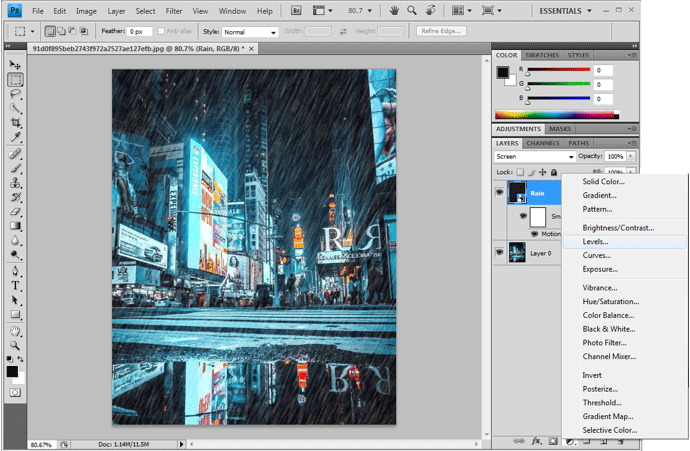 We have three points for level adjustments to move the first and last points (black and white sliders) closer to each other slightly by checking the changes happening as moved. And fix the levels at the exact required range so that we can get the look and feel of the rain following from an angle with a certain speed.