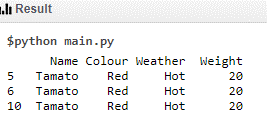 print (df[(df.Weight == 20) & (df.Colour =='Red') & (df.Weather =='Hot')])