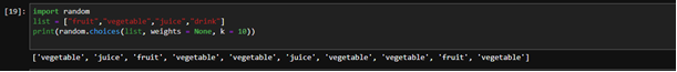 print(random.choices="auto">(list, weights =[6,1,1,1], k = 10))